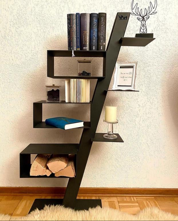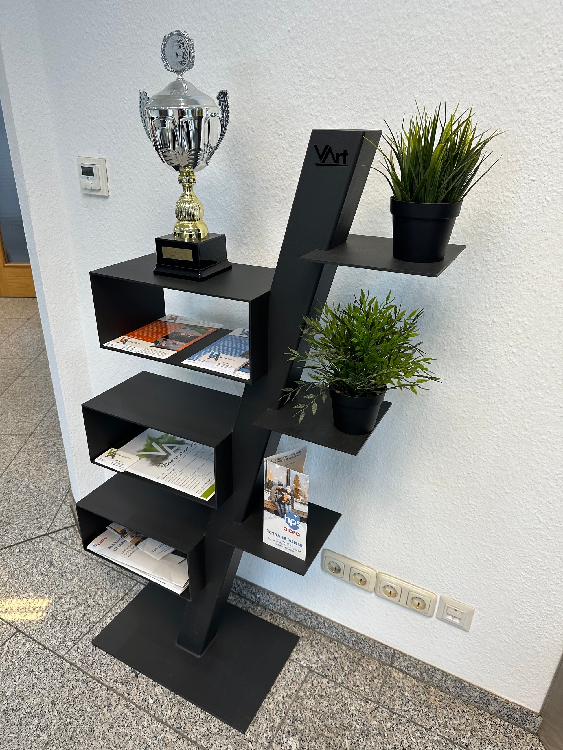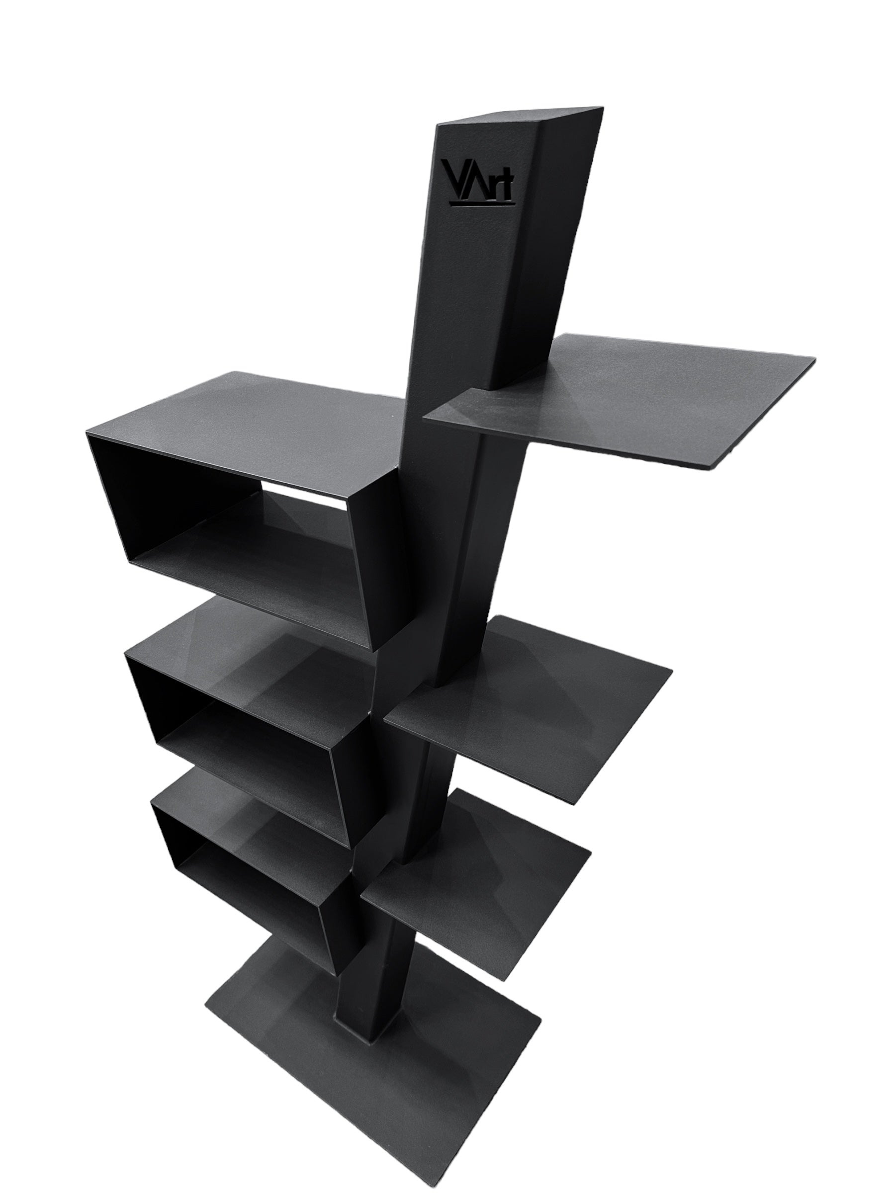 Futuristisches Stahl-Regal. Es kann zur Ausstellung von Artikeln, Dekoration oder Zeitschriften genutzt werden.